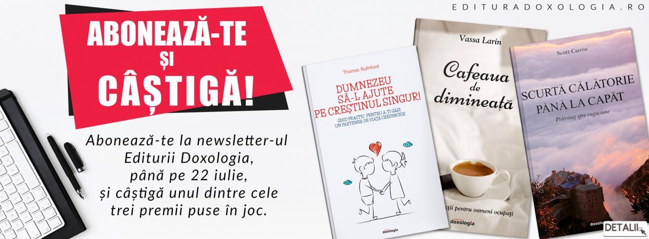 Vom folosi datele de contact pe care ni le oferiți strict pentru a vă informa despre promoțiile și noutățile pe care le avem. Pentru aceasta, este necesar să bifați caseta de mai sus. Vă puteți dezabona oricând apăsând pe butonul de dezabonare din subsolul oricărui mesaj pe care îl primiți de la noi sau scriindu-ne la comenzi@edituradoxologia.ro.