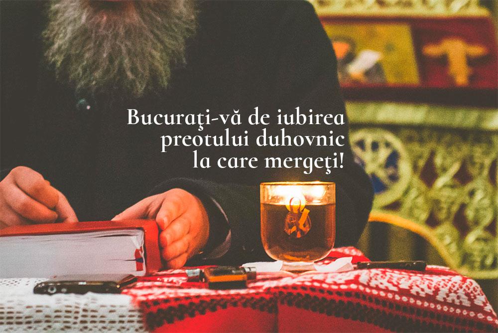 Bucuraţi-vă de iubirea, compasiunea, sinceritatea preotului duhovnic la care mergeţi! Nu-i cereţi să facă imposibilul. Când mergem în munţi căutăm o călăuză care a străbătut drumul şi s-a întors cu bine. Nimeni dintre noi [preoţii] nu poate spune că am parcurs tot drumul până în Împărăţia lui Dumnezeu şi am intrat în ea. Nu putem decât spune: „Ne aflăm pe cale şi putem merge cu voi, putem împărtăşi cu voi toată cunoaşterea noastră, putem să vă sprijinim în momentele de slăbiciune. Vom face tot ce ne stă în putinţă pentru ca voi să ajungeţi în Împărăţia lui Dumnezeu”.