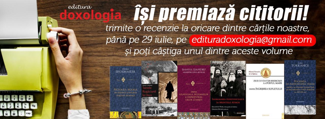 Scrie o recenzie la oricare dintre cărțile noastre până pe 29 iulie, trimite-o pe adresa de e-mail edituradoxologia@gmail.com și poți câștiga unul dintre cele șase titluri puse de noi în joc. Cele mai bune recenzii vor fi premiate și publicate pe blogul editurii.