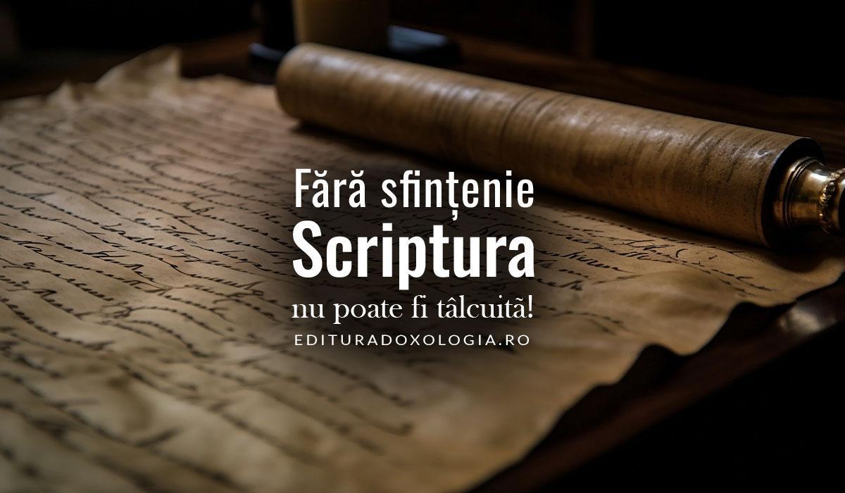 Fără sfințenie Scriptura nu poate fi tâlcuită. Dovadă este faptul că cele mai mari rătăciri și înșelări, care lovesc astăzi societatea și fărâmițează Biserica în mii de grupări, izvorăsc din tâlcuirea greșită a Scripturii. Nu fiindcă este de vină Scriptura, ci pricina este egoismul și prostia omului.