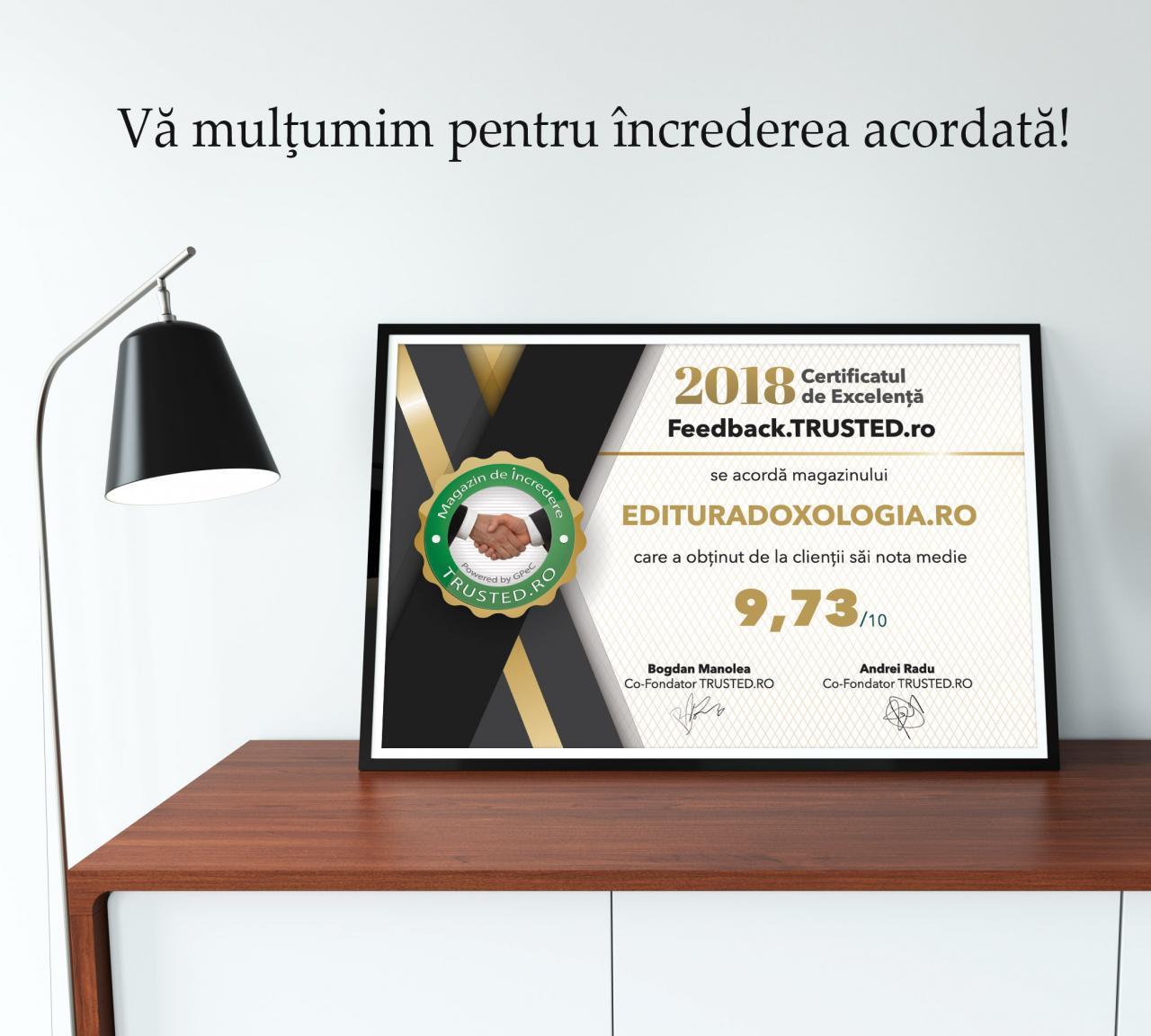 Folosindu-ne de blogul Editurii Doxologia, ținem să vă mulțumim pentru încrederea acordată, deoarece acest punctaj se datorează 100% dumneavoastră, cititorii cărților Doxologia. Vă mulțumim și sperăm ca această familie a Editurii Doxologia să crească de la an la an și să vă ofere cât mai multe surprize editoriale plăcute, iar experiența cumpărăturilor online să fie una cât mai eficientă pentru dumneavoastră.