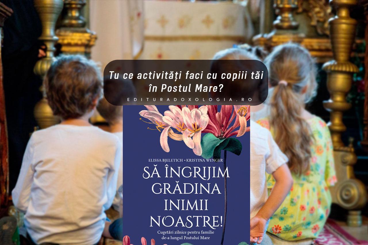 „Să îngrijind grădina inimilor noastre” îți urează bun venit! Sperăm că tu și copiii tăi vă veți alătura călătoriei noastre de-a lungul Postului Mare și Săptămânii Mari. Pentru fiecare zi vom oferi o scurtă lectură, urmată de câteva întrebări care te vor ajuta să îți atragi copiii în dialoguri despre credință în contextul acestui timp de creștere duhovnicească și de înnoire. Uneori vom alege o povestire din Biblie, alteori o povestire din viața unui sfânt și, din când în când, doar o mică lecție sau idee legată de Post. Aceste meditații sunt gândite pentru a fi citite zilnic.[...]